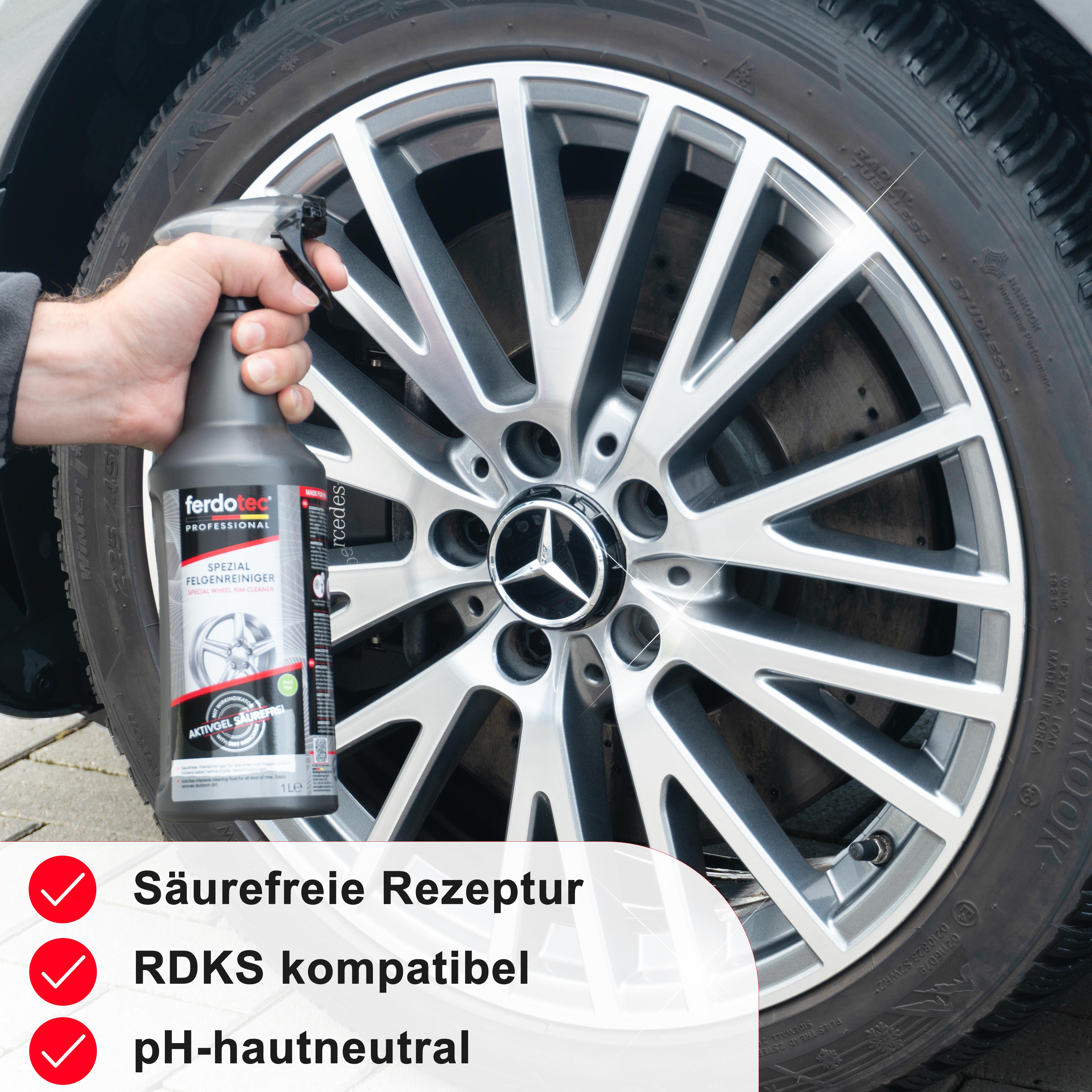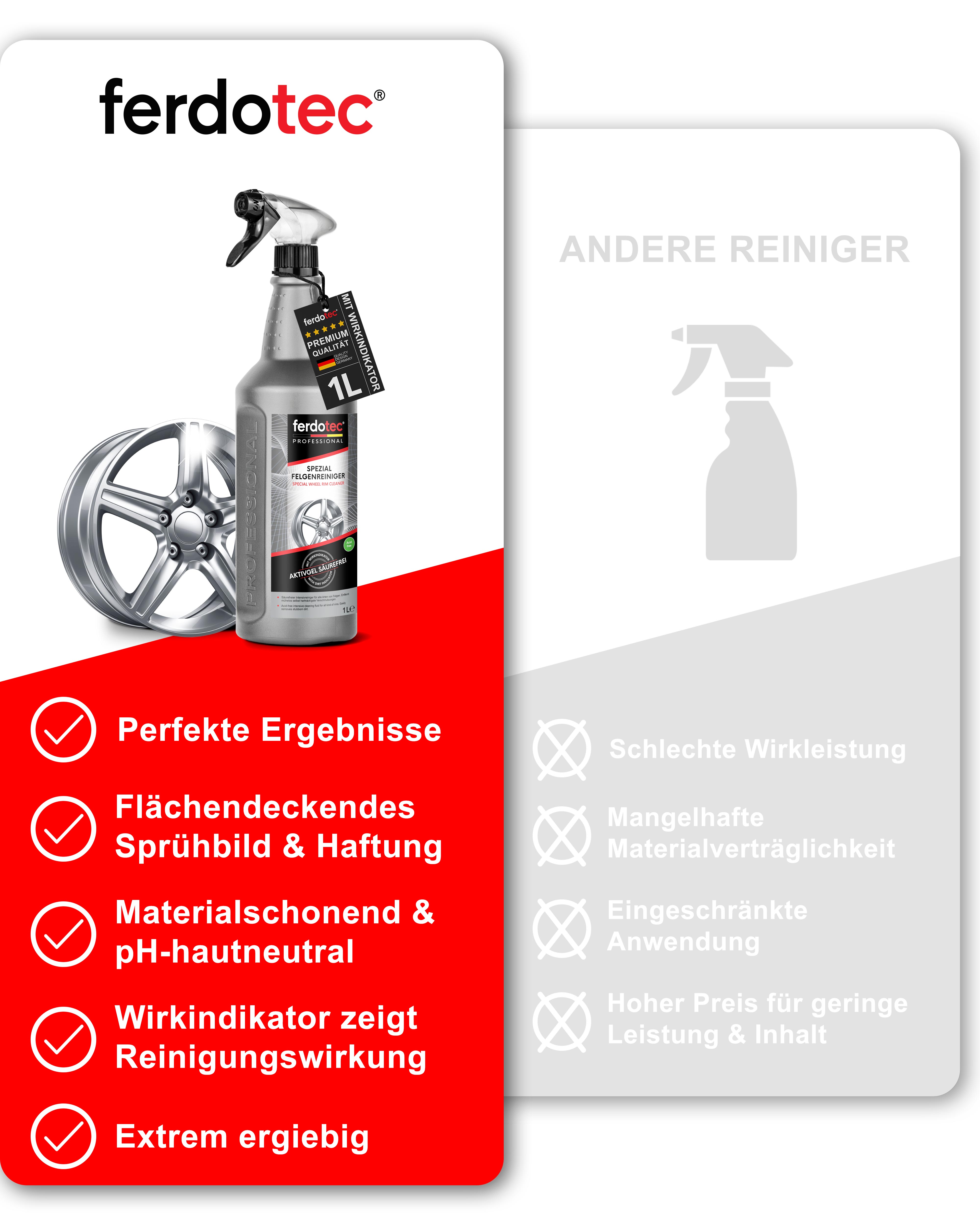 Unser ferdotec® Premium Felgenreiniger für Autos ist die perfekte Lösung, um hartnäckigen Bremsstaub, Straßenschmutz und andere Verschmutzungen von Ihren Felgen zu entfernen. Mit seiner kraftvollen Formel und der einfachen Anwendung sorgt dieser Reiniger dafür, dass Ihre Felgen wie neu aussehen und sich in einem erstklassigen Zustand präsentieren. Der Reiniger greift weder die Felgenoberfläche noch Radbolzen oder lackierte Materialien an. Darüber hinaus ist der Reiniger auch für Fahrzeuge mit RDKS (Reifendruck-Kontrollsystem) geeignet. Für alle Arten von gängigen Felgen geeignet: Der ferdotec® Felgenreiniger kann bedenkenlos auf Chromfelgen, Alufelgen, Stahlfelgen sowie pulverbeschichteten oder lackierten Felgen verwendet werden. Besonders leicht anwendbar in einer Pumpsprühflasche für Felgenreiniger.