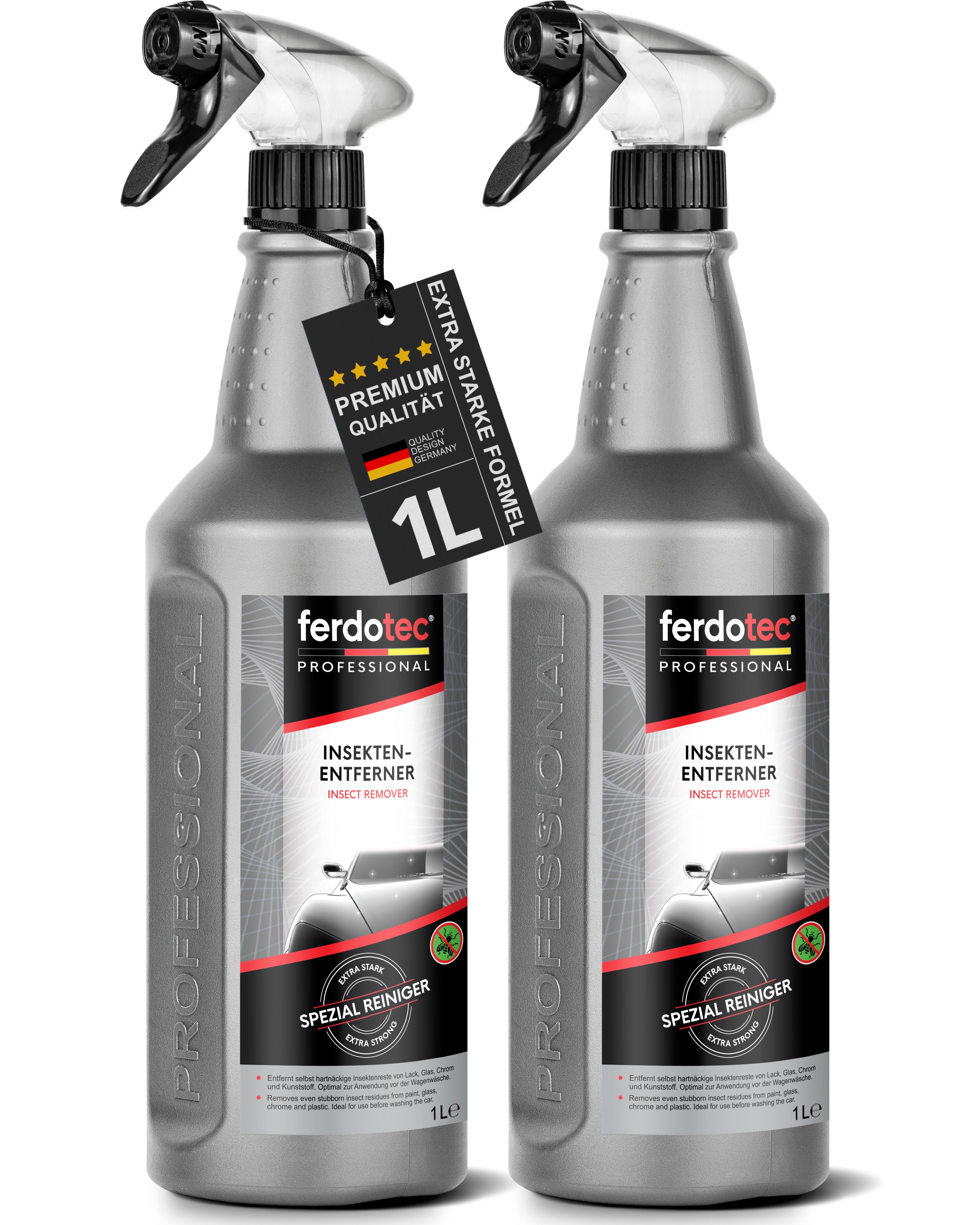 ferdotec Insektenentferner ist optimal für die Vorreinigung für die Waschanlage, um alle Insektenreste möglichst effektiv vom Fahrzeug zu entfernen. Besonders die Windschutzscheibe, A-Säule, Spiegelkappen, Motorhaube, Stoßstange und der Kühlergrill bieten sich für die Vorbehandlung hervorragend an um ein optimales Reinigungsegebnis zu erzielen. Der Insektenentferner kommt dabei ohne aggressive Inhaltsstoffe aus und ist zu 100% biologisch abbaubar. Um eine optimale Wirkung zu erzielen wird unser Insektenentferner flächendeckend und direkt auf die verschmutzte Oberfläche gesprüht. Einmal aufgesprüht dringt dieser tief in die vorhandenen Rückstände ein und weicht die Insektenüberreste ein und löst diese schonend und zuverlässig von der Oberfläche. Durch die besondere Formulierung des Auftrags, dringt es besonders schnell in die Inseenktenreste ein und ist sehr sparsam in der Anwendung. Wir haben bewusst auf eine flüssige Konsistenz gesetzt, da sich eine Gelförmige Viskosität nicht optimal auf den betroffenen Stelle verteilt. Unser kraftvoller Reiniger löst selbst angetrocknete Insektenverschmutzungen von Lack, Glas, Chrom und Kunststoff zuverlässig und effektiv ab, ohne die Oberflächen anzugreifen.