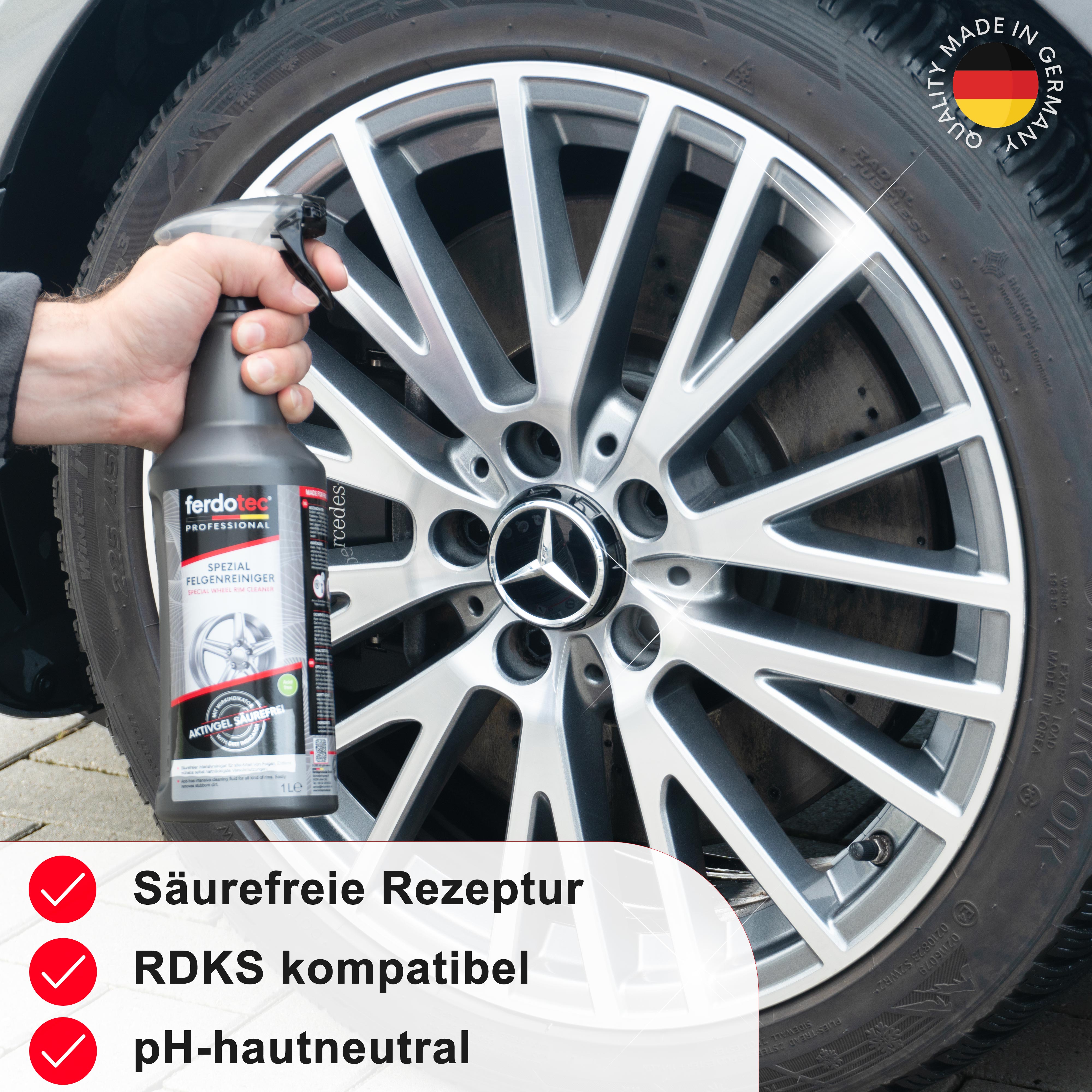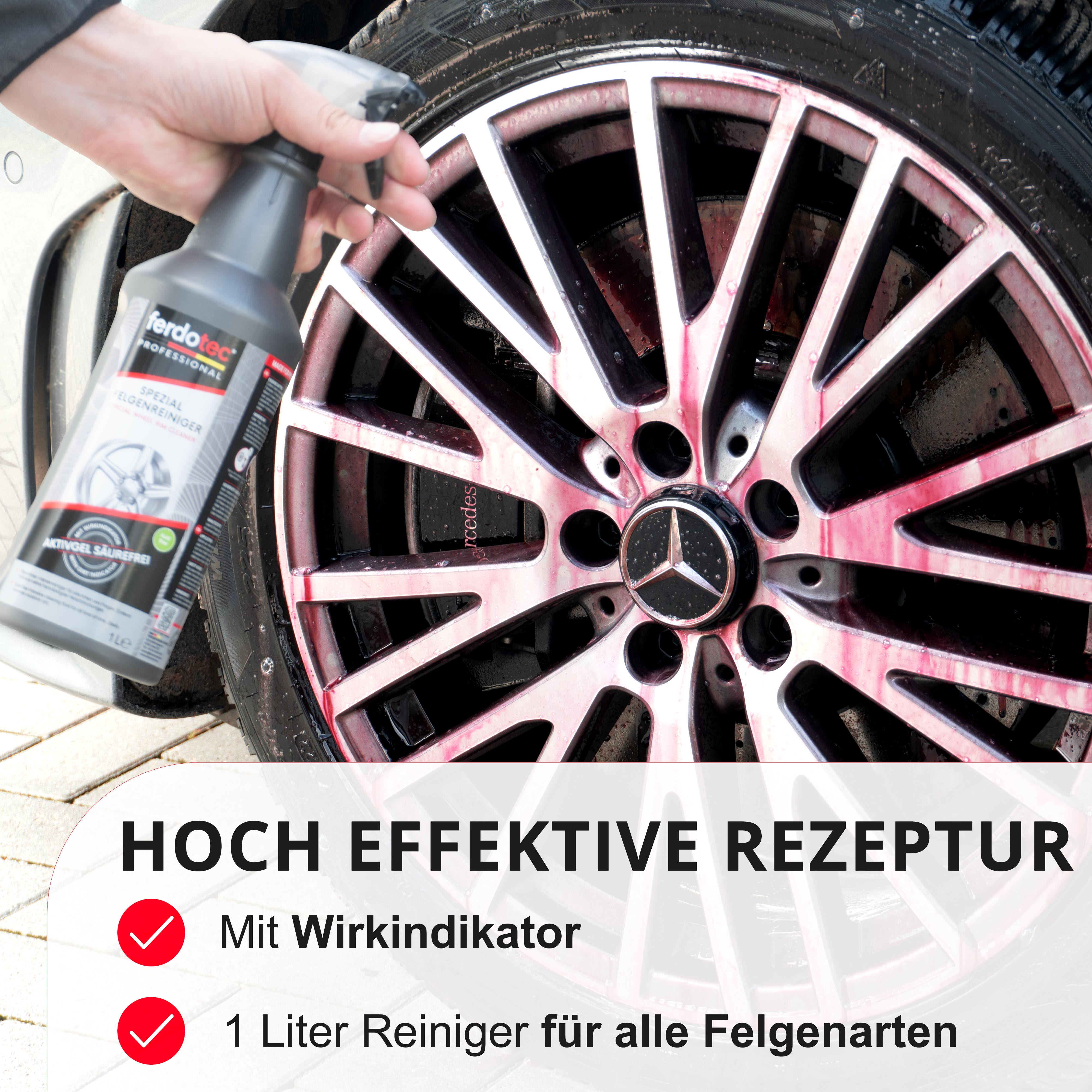 Unser ferdotec® Premium Felgenreiniger für Autos ist die perfekte Lösung, um hartnäckigen Bremsstaub, Straßenschmutz und andere Verschmutzungen von Ihren Felgen zu entfernen. Mit seiner kraftvollen Formel und der einfachen Anwendung sorgt dieser Reiniger dafür, dass Ihre Felgen wie neu aussehen und sich in einem erstklassigen Zustand präsentieren. Der Reiniger greift weder die Felgenoberfläche noch Radbolzen oder lackierte Materialien an. Darüber hinaus ist der Reiniger auch für Fahrzeuge mit RDKS (Reifendruck-Kontrollsystem) geeignet. Für alle Arten von gängigen Felgen geeignet: Der ferdotec® Felgenreiniger kann bedenkenlos auf Chromfelgen, Alufelgen, Stahlfelgen sowie pulverbeschichteten oder lackierten Felgen verwendet werden. Besonders leicht anwendbar in einer Pumpsprühflasche für Felgenreiniger.